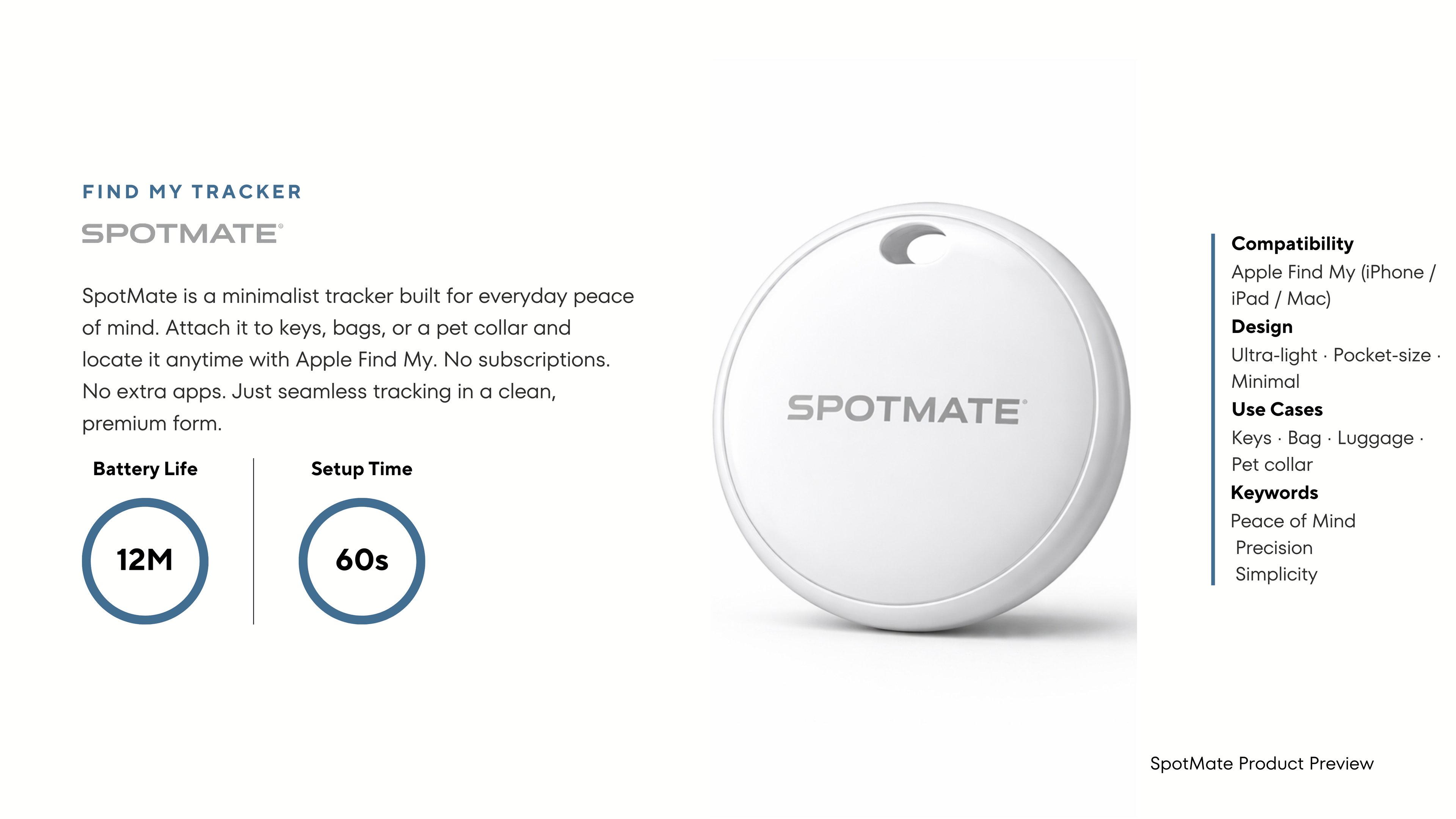 SpotMate™ is a compact smart tracker designed to help you keep track of what matters most.